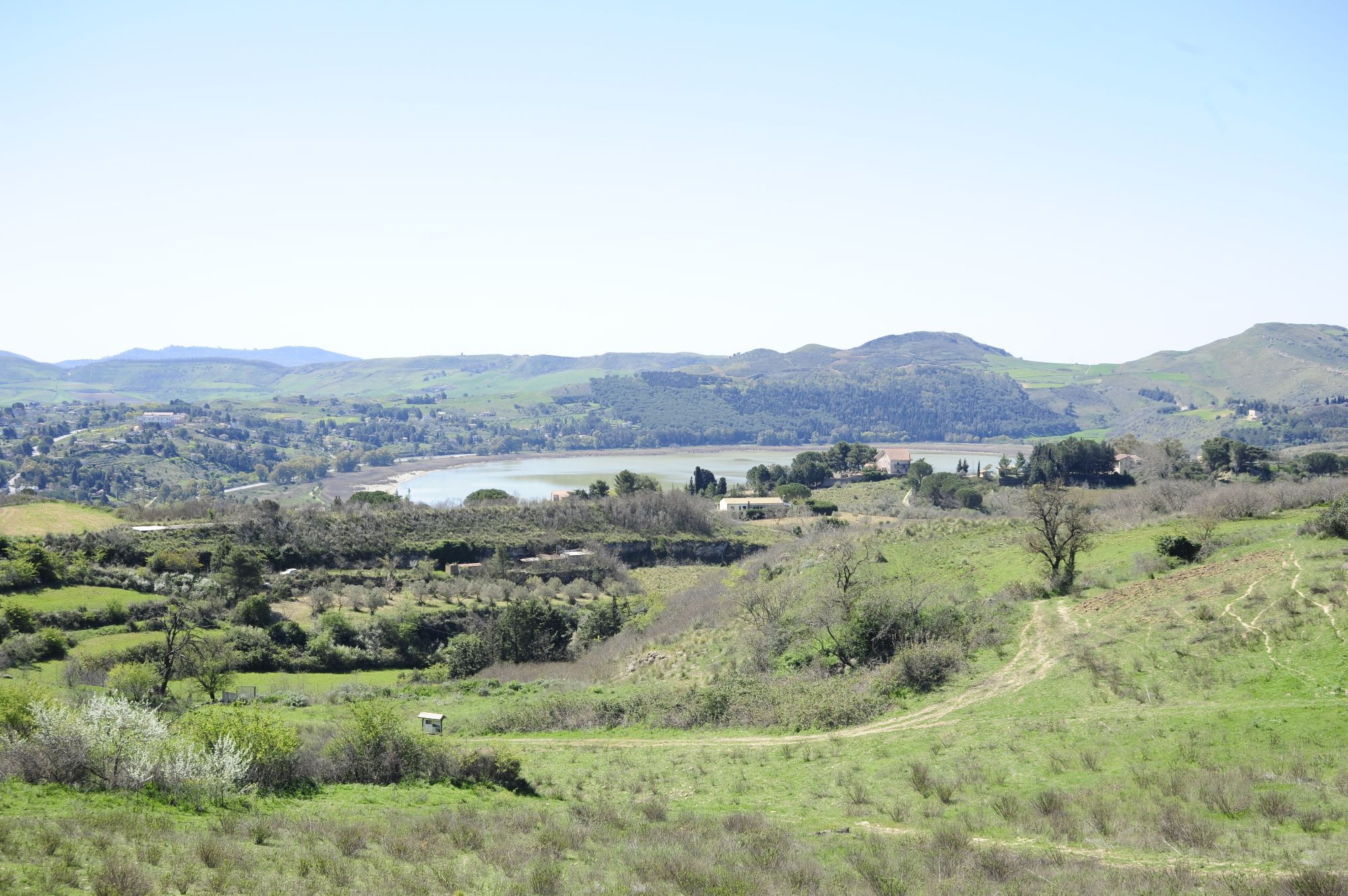 Si scende attraversando nuovamente il villaggio questa volta toccando la Piazza della fondazione fascista con il monumentale obelisco e, raggiunto il Visitor center, si termina con un giro ad anello attorno al lago, luogo di grandi contingenti di uccelli acquatici ed unico lago naturale della Sicilia interna.