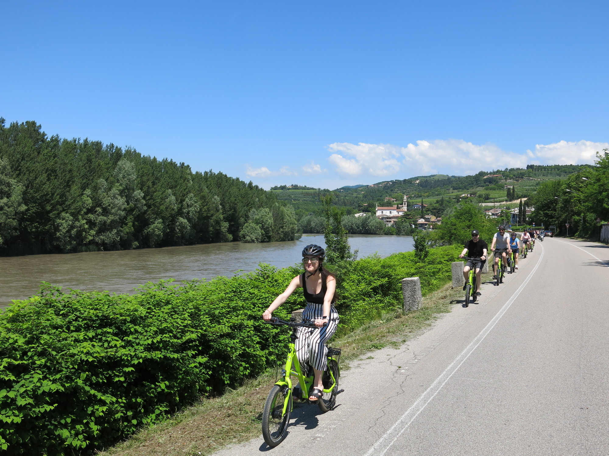 Questa facile pedalata ci porta a scoprire la regione vinicola della Valpolicella. Usciamo dalla città in tutta sicurezza lungo una pista ciclabile che ci porta tra gli immensi campi coltivati a vigneto della Valpolicella. Una facile salita ci porta ad apprezzare il paesaggio sulle montagne e le colline terrazzate e passiamo a fianco di un paio di eleganti ville venete.