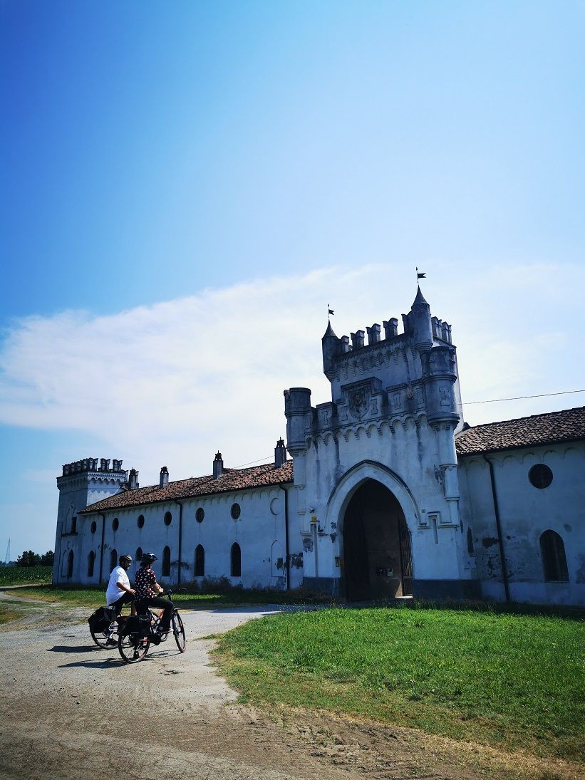 La grande cascina a corte, dall'impianto probabilmente settecentesco, ha subito una rielaborazione dell'ingresso principale, e probabilmente delle torri angolari, in forme neocastellane (e quindi di schietto carattere romantico) verso gli inizi del XIX secolo, forse ad opera dell'architetto Voghera. La parziale trasformazione, incongrua dal punto di vista storico e funzionale, rientra però pienamente nell'ambito dell'architettura neocastellana ottocentesca, che ha avuto esempi eccezionali come il castello di Costigliole, in Piemonte, e che ha trovato nel territorio cremonese, grazie soprattutto all'appassionata opera dell'architetto Voghera, una vasta diffusione.