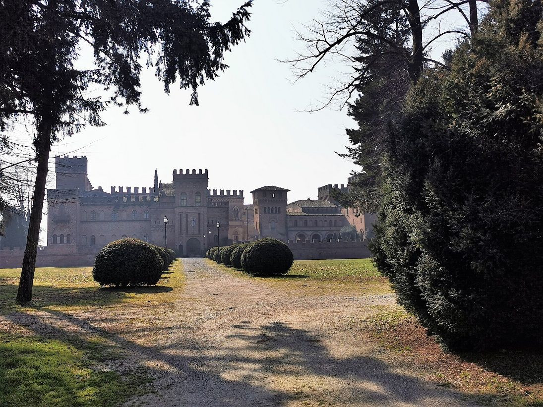 Alla facciata dell’immensa costruzione, con la torre merlata centrale che riporta lo stemma del Casato, che sovrasta l’ingresso principale, si accede percorrendo un vialetto di 150 metri, che attraversa la parte anteriore del parco.