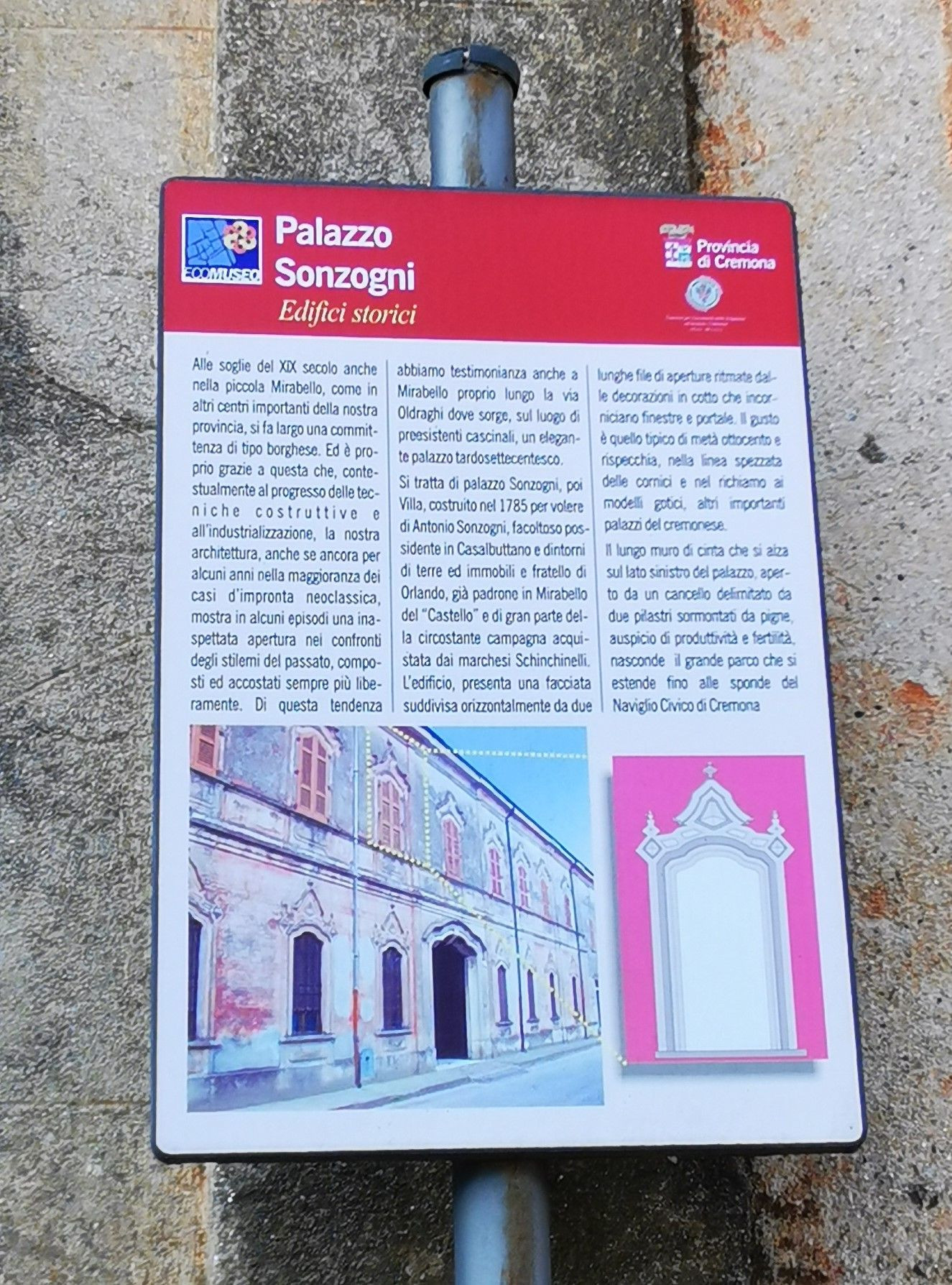 Alle soglie del XIX secolo nella piccola Mirabello si fa largo una committenza di tipo borghese. Il palazzo Sonzogni è stato costruito nel 1785 da Antonio Sonzogni, facoltoso possidente in Casalbuttano e dintorni di terre ed immobili, e fratello di Orlando che è padrone del 'Castello' di Mirabello e di gran parte della campagna circostante. L' edificio ha una facciata suddivisa orizzontalmente da due lunghe file di aperture ritmate dalle decorazioni in cotto che incorniciano finestre e portale. Il gusto è quello tipico di metà Ottocento.