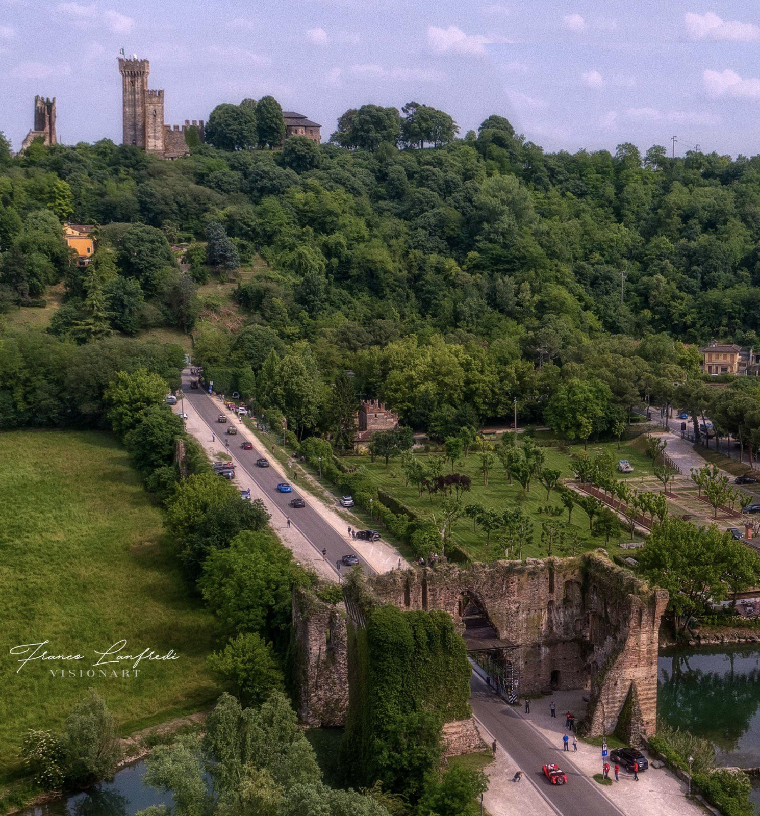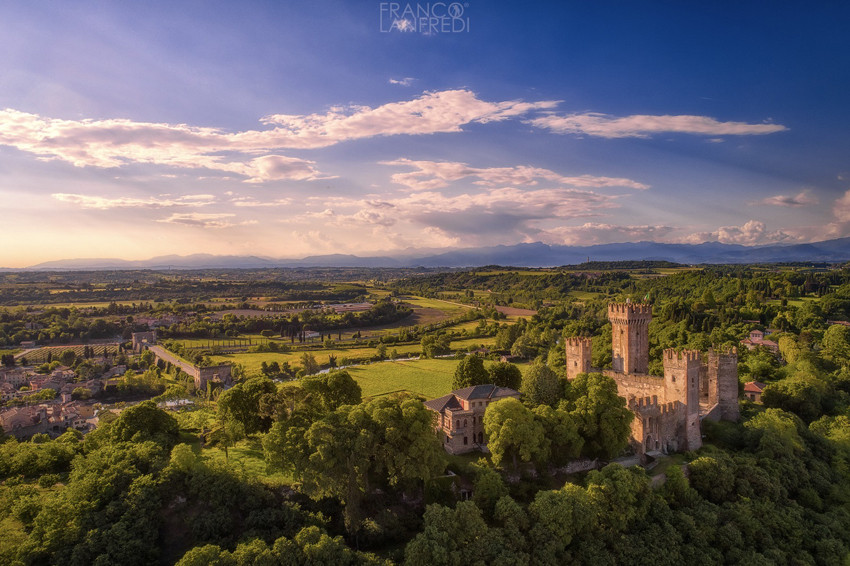 L'escursione parte alle pendici del mastio del castello Scaligero di Valeggio, per scoprire le vie del centro storico e il leggendario tortellino. Si prosegue passando sotto il campanile della chiesa di Santa Lucia dei Monti per dirigersi verso le Terre del Custoza, dominate da un'altra linea verticale, quella dell'Ossario. Tra dimore storiche e cantine il percorso ritorna nel territorio valeggiano e scende giù lungo il fiume Mincio passando per il vecchio tracciato della Littorina, dove altre linee verticali guidano il nostro percorso, la centrale idroelettrica di Ponti sul Mincio e il suo castello Scaligero.