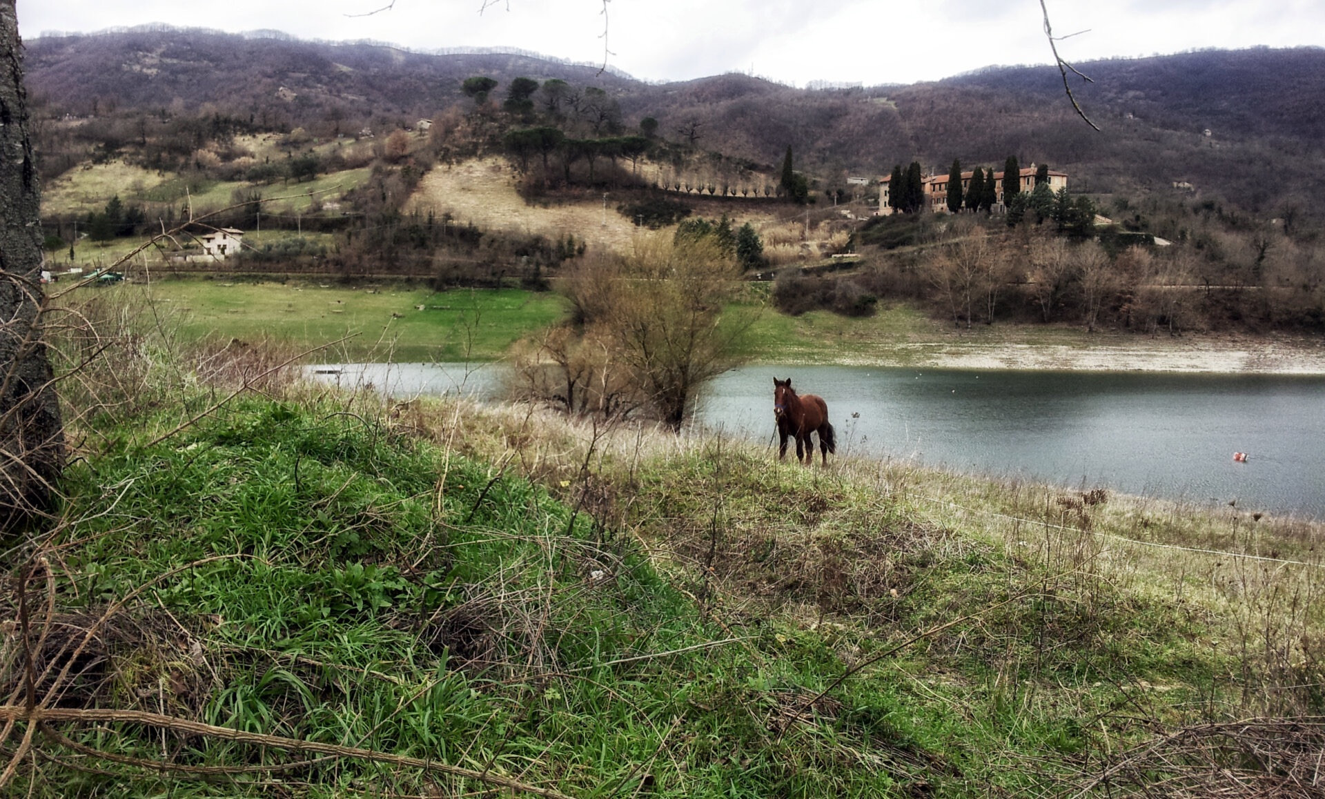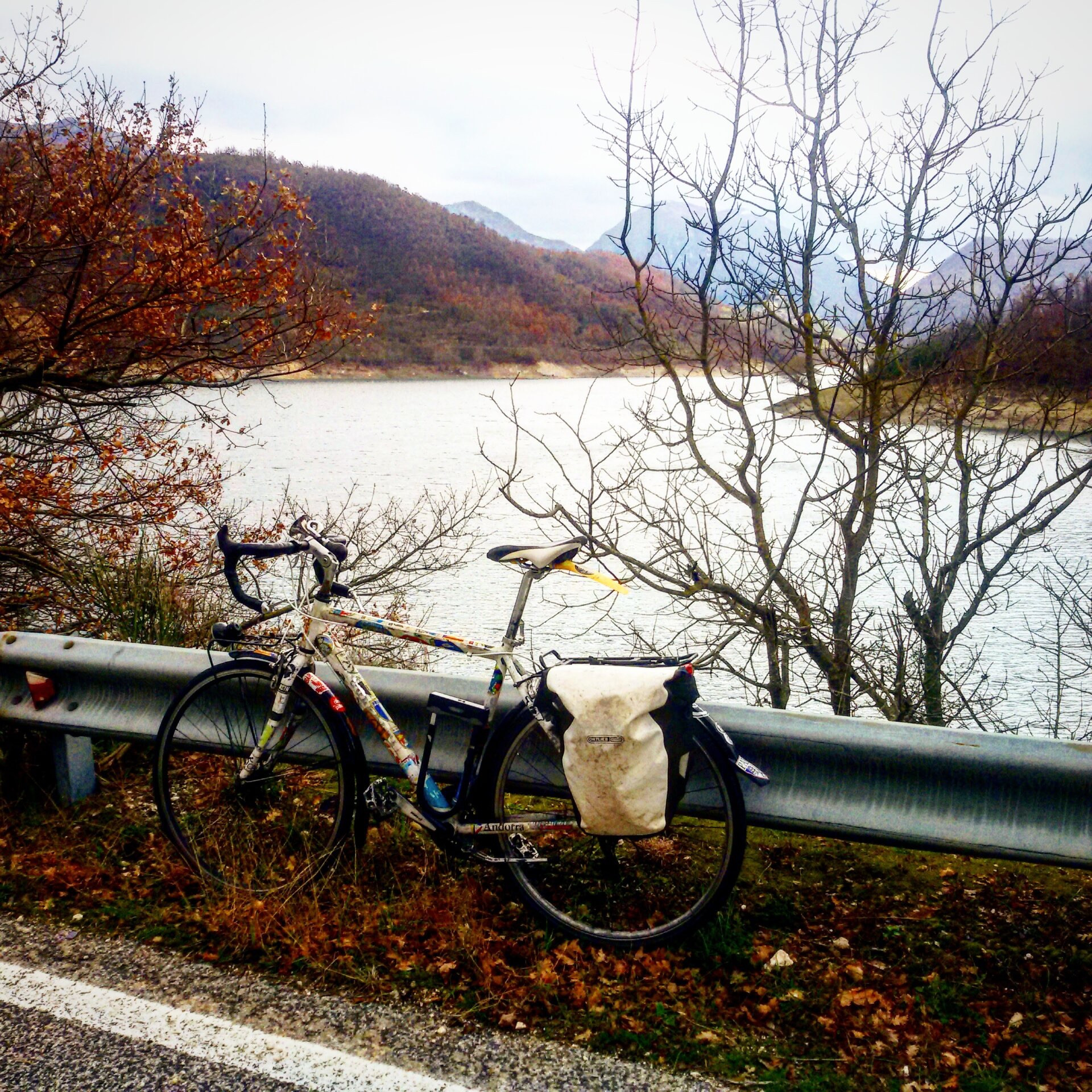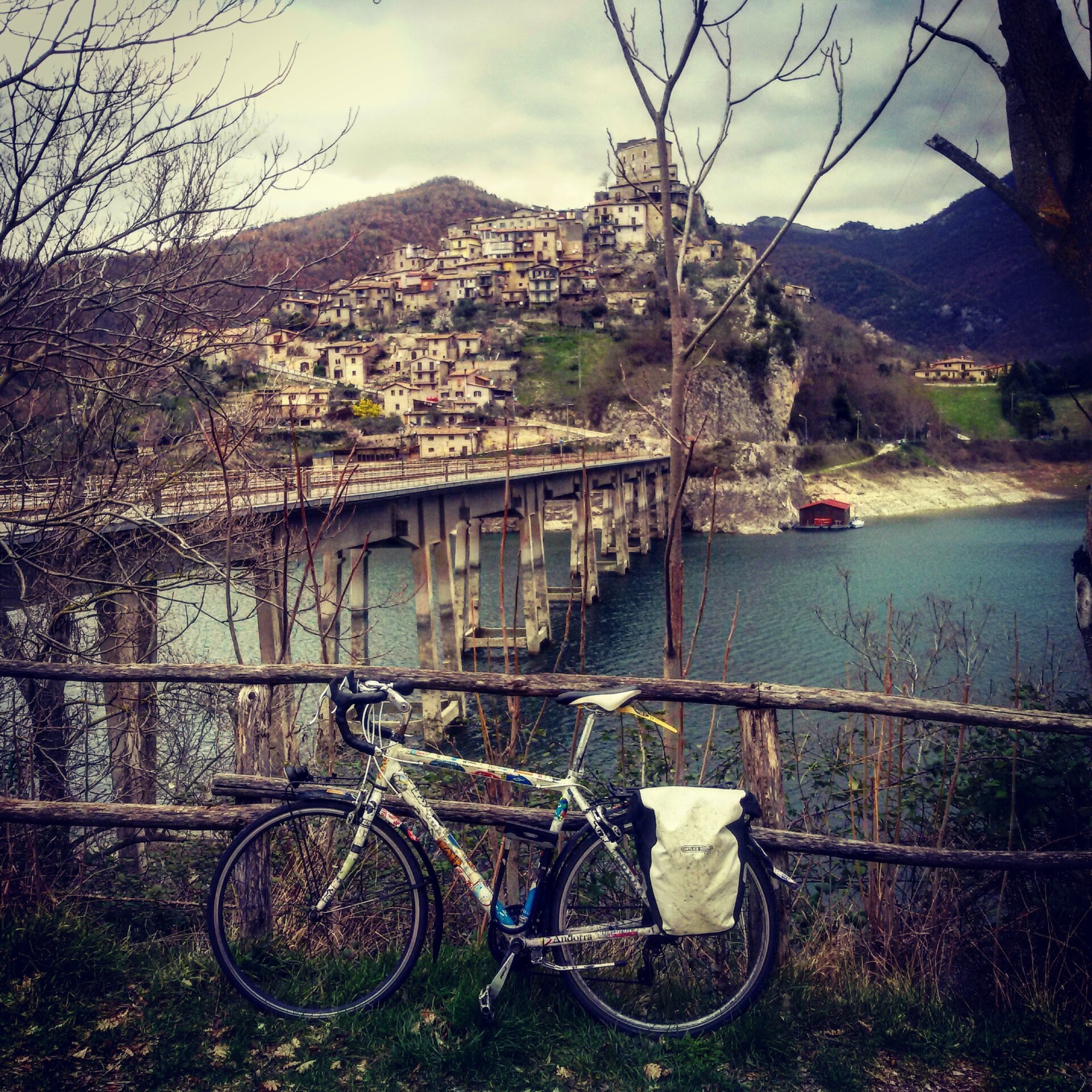 , il percorso del GTL svolta verso nord e punta alla Sabina, verso il quarto capoluogo di provincia della regione: dopo Roma, Latina e Frosinone, questa tappa ci porta a Rieti, il “centro geografico d’Italia”. Per farlo sceglie la strada più gentile e meno aspra attraverso i monti, continuando a seguire il Cammino di San Benedetto come già avvenuto nella tappa 6. Saliamo di quota passando per borghi incastonati nel verde dei boschi appenninici, Riofreddo, Vallinfreda, Orvinio, per poi addentrarci nella valle del Turano, dove nel 1939 si formò l’omonimo lago, in seguito alla costruzione di un’enorme diga. Il tracciato segue infatti un’andatura pianeggiante e addirittura in leggera discesa nel suo complesso, con due soli piccoli strappi in salita, offrendo il piacere di pedalare tra le montagne senza pedalare troppo.Questa vallata non è servita da treno o autostrade, ed è rimasta relativamente tranquilla e al sicuro dai grandi flussi turistici. Il fiume che costeggiamo, chiamato anch’esso Turano, si ingrossa gradualmente fino a diventare un fiordo, ramo meridionale del lago: i suoi contorni sono spesso nebbiosi, umidi e inquietanti.Arriviamo così ai due borghi di Castel di Tora e Colle di Tora, che si guardano dalle due sponde del lago, e delle rovine del castello di Antuni, ammassate su un’isoletta nei pressi del ponte che unisce i due lati. Dopo Colle di Tora ci sono le uniche pendenze da affrontare per arrivare alla diga del Turano: pochi tornanti nel bosco, e siamo alla gigantesca parete di cemento che trattiene il corso del fiume. Vale la pena una piccola deviazione per i paesi di Rocca Sinibalda, dove sorge l’impressionante Castello Sforza Cesarini, originario dell’XI secolo, e Posticciola, originario avamposto romano e passaggio di transumanza. Da qui in poi è tutta discesa: perdiamo la quota guadagnata in una strada snobbata dal traffico, per coprire in scioltezza gli ultimi chilometri pianeggianti verso il capoluogo sabino.