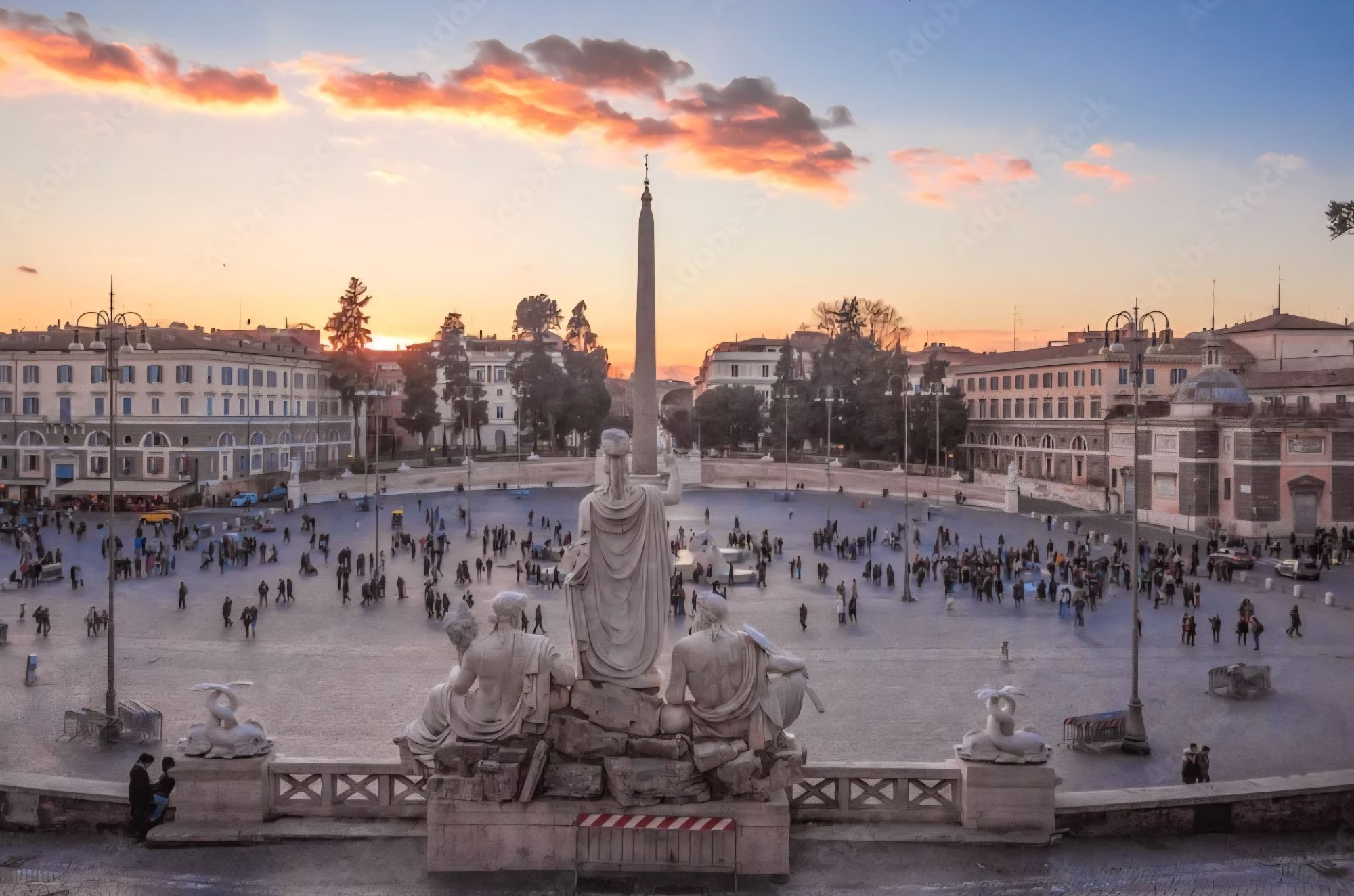 Terza tappa del nostro tour è piazza del Popolo. Al centro svetta l’Obelisco Flaminio, originale stele egizia alta 24 metri. Realizzata nel XIII secolo a.C., l’opera venne trasportata a Roma da Augusto nel 10 a. C. La sua sede originaria era nel Circo Massimo; spostarlo a piazza del Popolo, il luogo da cui si diramano le tre vie del Tridente, fu una decisione di papa Sisto V.