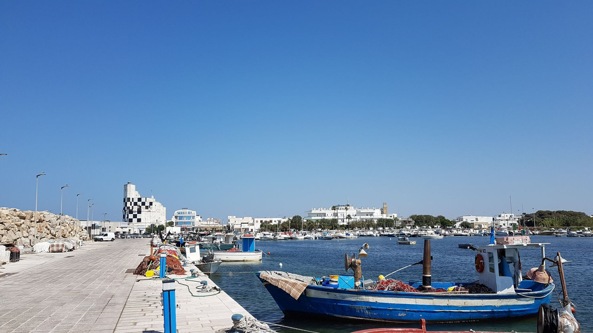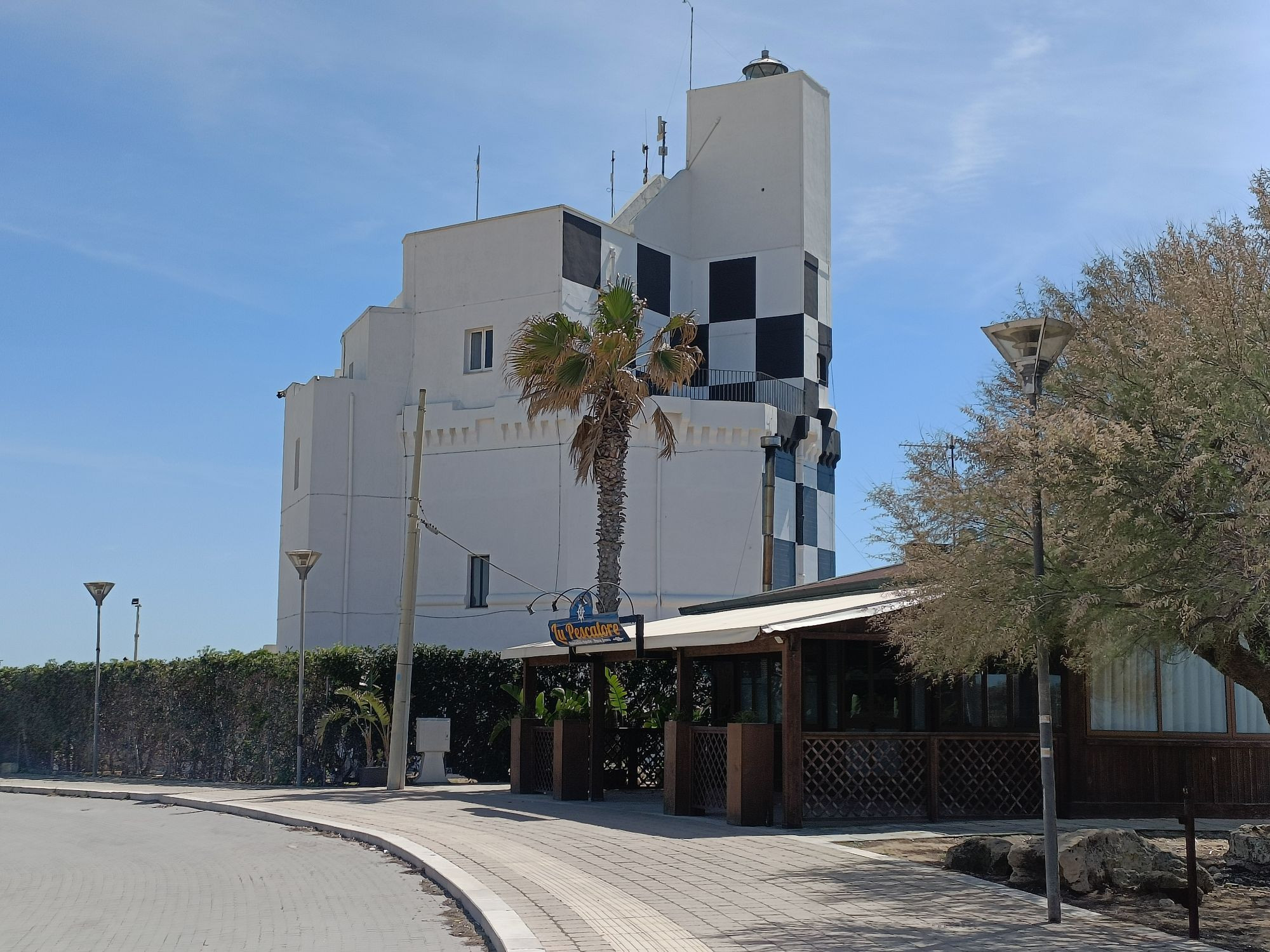 Il faro di Torre San Giovanni si staglia contro il cielo blu del Salento, a protezione del porticciolo della piccola marina di Ugento. Ha una struttura molto particolare: lo contraddistingue la caratteristica colorazione a scacchiera bianca e nera, mentre la sua architettura è quella di una antica torre di avvistamento. La sua storia inizia nel XVI secolo, quando tutto il territorio dell’allora Regno di Napoli fu munito di un sistema difensivo che comprendeva una serie di torri di vedetta, fondamentali per avvistare il nemico proveniente dal mare.