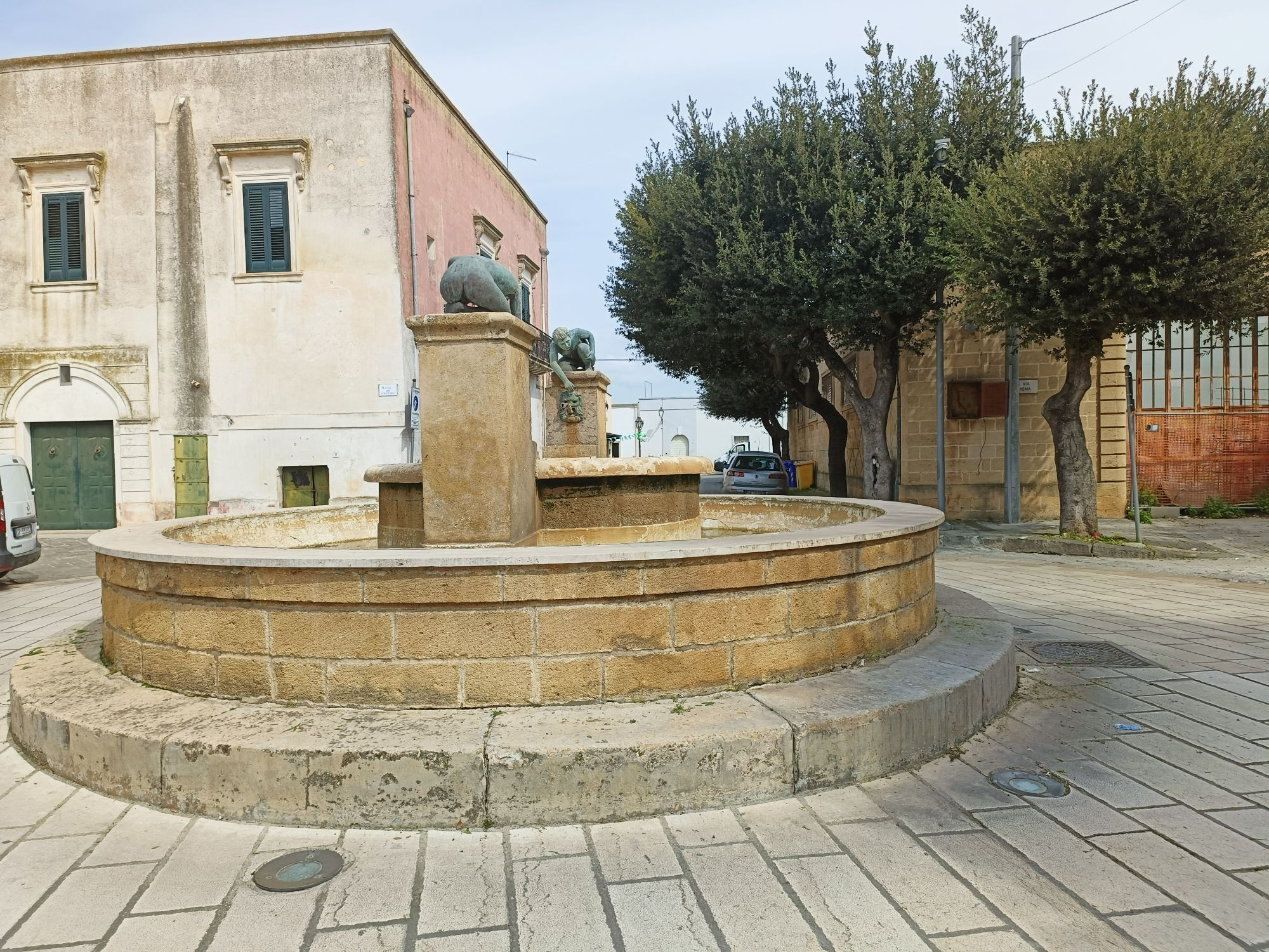 Una vasca in pietra locale di forma rotonda costituisce la struttura principale. Su due pilastri che delimitano la fontana, le statue di due giovani ragazzi protendono il braccio destro verso l’acqua, che dona una sensazione di freschezza durante le calde e afose giornate dell’estate salentina.