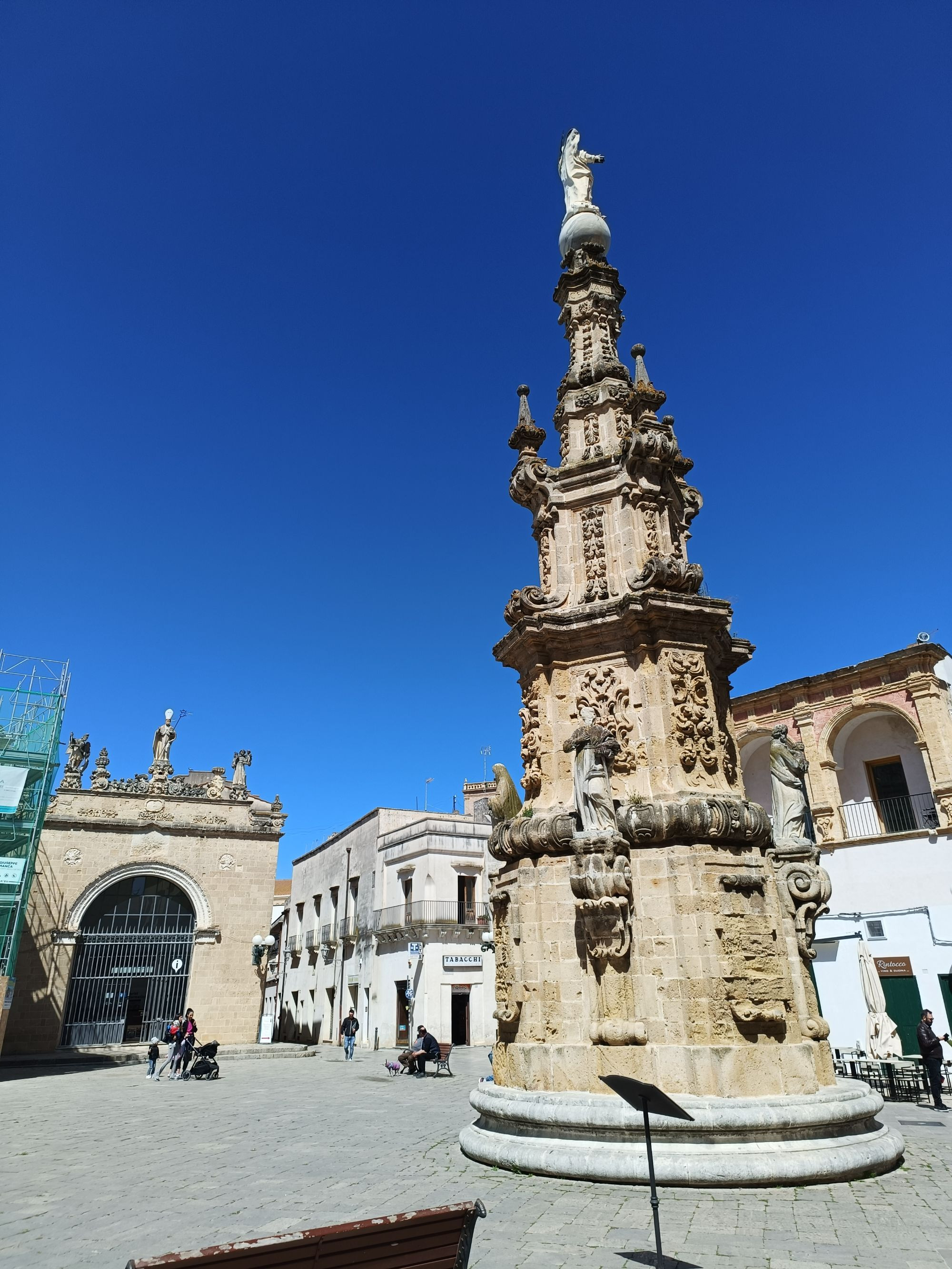 Un simbolo di Nardò nel cuore di Piazza SalandraNel centro di Piazza Salandra domina la scena l’elegante guglia dell’Immacolata, che risale al 1769. Il carparo locale, la pietra di colore dorato di cui è fatta, mette in risalto le decorazioni barocche che la arricchiscono: festoni, pennacchi, elementi floreali, fregi e cuspidi. La guglia si slancia verso il cielo con una forma piramidale ottagonale e culmina in cima con un globo di pietra che regge la statua della Madonna Immacolata, alta ben 3 metri e scolpita in pietra leccese.