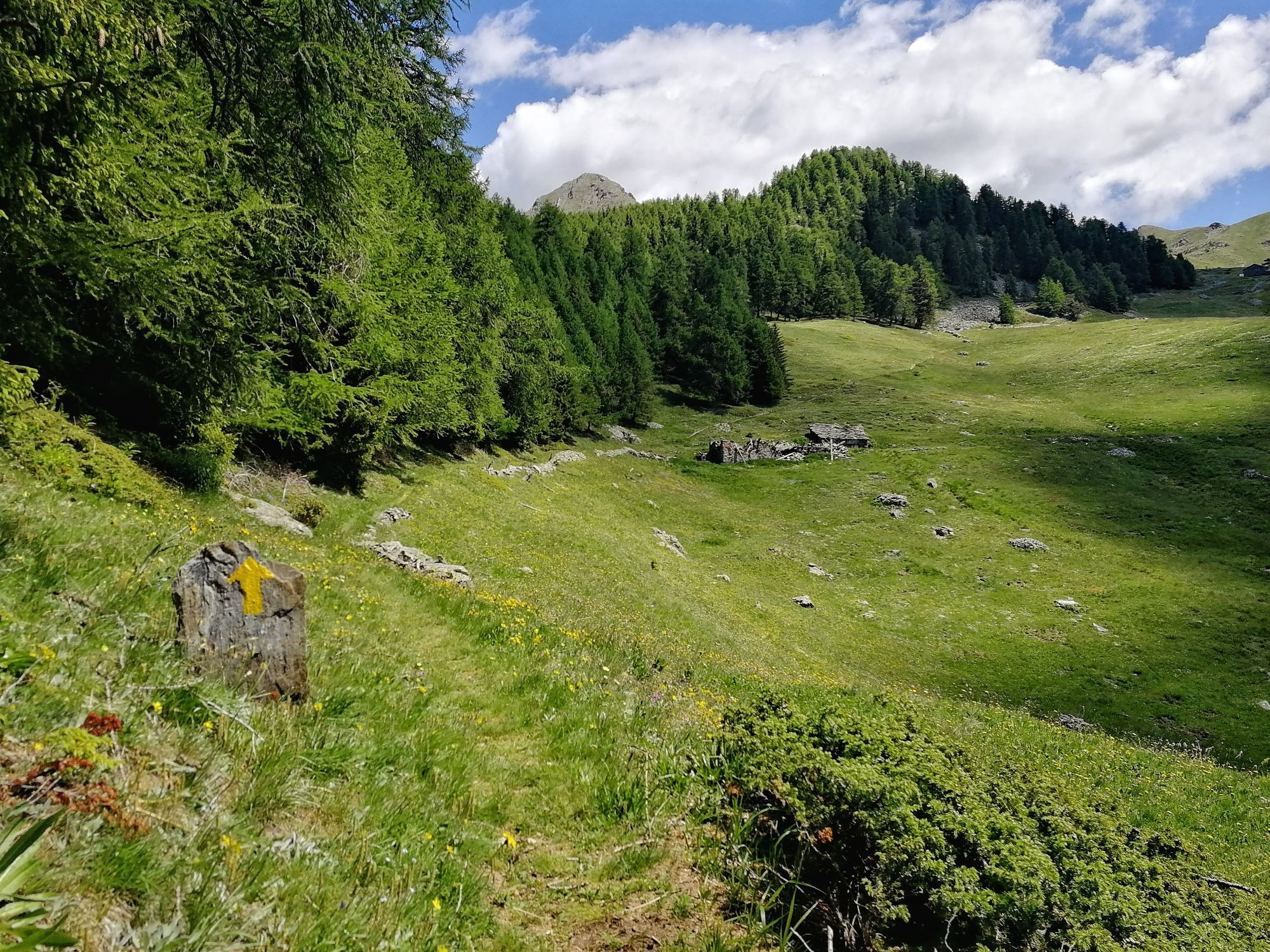 Da qui inizia alla destra dell'alpeggio il sentiero che permette di affrontare un single tranck lungo circa 5 km con un dislivello negativo di 700m. Dopo circa 300m al bivio tenere la sinistra. Il percorso è un ripido sentiero che permette di raggiungere in poco tempo la graziosa frazione di Lod.