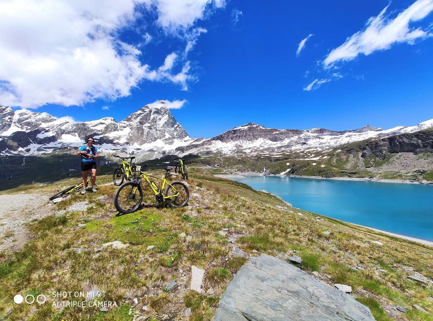Si parte dalla frazione Brengon di fronte all'Hotel Tantané e si sale in direzione Veuillen verso la famosa passeggiata La Magdeleine/Chamois. Dopo circa 2 km di asfalto la strada diventa sterrata e va percorsa in direzione laghi di Champlong per circa 3 km fino a 2400 m. (strada bianca piuttosto ripida). Una volta giunti ai laghetti continuare sulla stessa strada fino a scollinare e iniziare la discesa verso l'alpeggio Foresus (discesa ripida ma su strada bianca). Una volta giunti all'alpeggio Foresus prendere la prima strada a destra e salire verso gli impianti di risalita del comune di Chamois, passando per un grazioso alpeggio, Glavin. Giunti alla stazione di sbarco della seggiovia prendere la strada che sale a destra e dopo circa 100m predere la deviazione verso sinistra. Dopo circa 200m arriverete ad un tornante, fare attenzione e prendere la strada che parte alla sinistra in leggera salita. La strada diventa un sentiero leggermente in discesa che dopo circa 300m si unisce al famoso percorso n. 107 balconata del Cervino. Seguire le indicazioni per il sentiero n. 107, dopo circa 1 km il sentiero diventa tecnico, CONSIGLIAMO A CHI NON SE LA SENTE DI SCENDERE DALLA BICICLETTA E SPINGERE PER CIRCA 15/20 MIN. Il sentiero torna di nuovo pedalabile se pur abbastanza tecnico e vi porta nella spendida conca di Cheneil. Giunti al villaggio prendere la strada bianca a sinistra e scendere stavolta, lungo la strada carrozzabile fino all'area pic nic di Champlève. Oltrepassare l'area pic nic e scendere ancora per circa 1 km fino a raggiungere un tornate con uno spiazzo alla sinistra che costeggia la pista di sci invernale. Prima del tornante prendere la strada a destra. Salire senza prendere particolari deviazioni fino all'arrivo dell'ovetto bianco di Salette, durata, circa un oretta. Arrivati alla stazione di sbarco dell'ovetto scendere a sinistra verso l'imbarco della seggiovia lungo la strada e prendere, dopo circa 100m il sentiero sulla destra, POCO VISIBILE ATTENZIONE!!! Giungerete ad un alpeggio con una strada bianca, imboccatela e inizate a scendere, al primo incrocio che trovate svoltate a destra, una strada semi pianeggiante vi conduce ad un altro bivio, prendete a destra e risalite per circa 20 minuti. Giungerete alla partenza del carrellino utilizzato per costruire la diga del Lago Goillet. Uno splendido oratorio vi aspetta per una pausa e per ammirare sua maestà il Cervino. Da qui la vecchia rotaia, ormai diventato sentiero, vi portera al Lago Goillet. Finita la rotaia prendete a destra e salite fino allo sbarramento del Lago e preparatevi allo spettacolo puro, meteo permettendo.