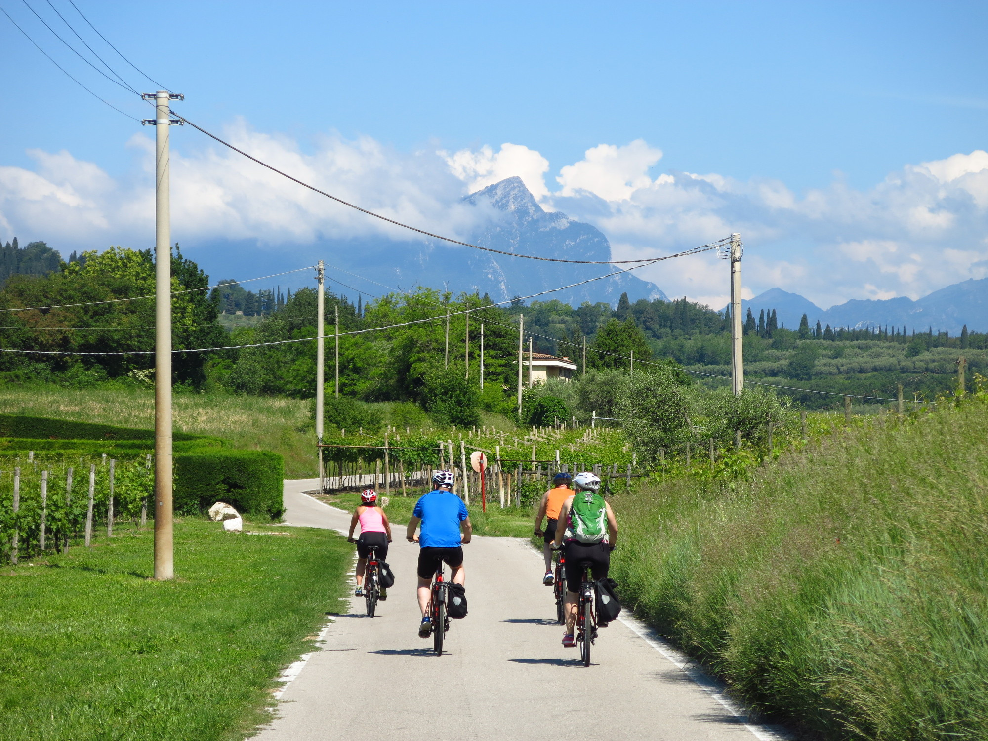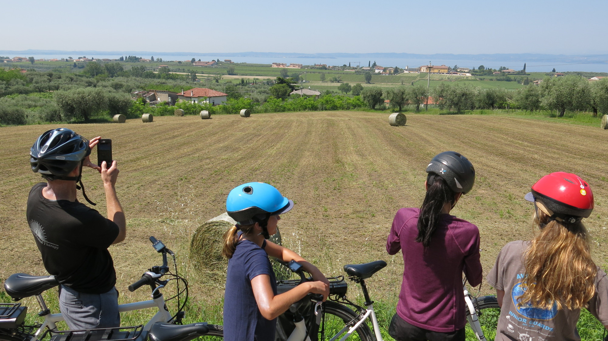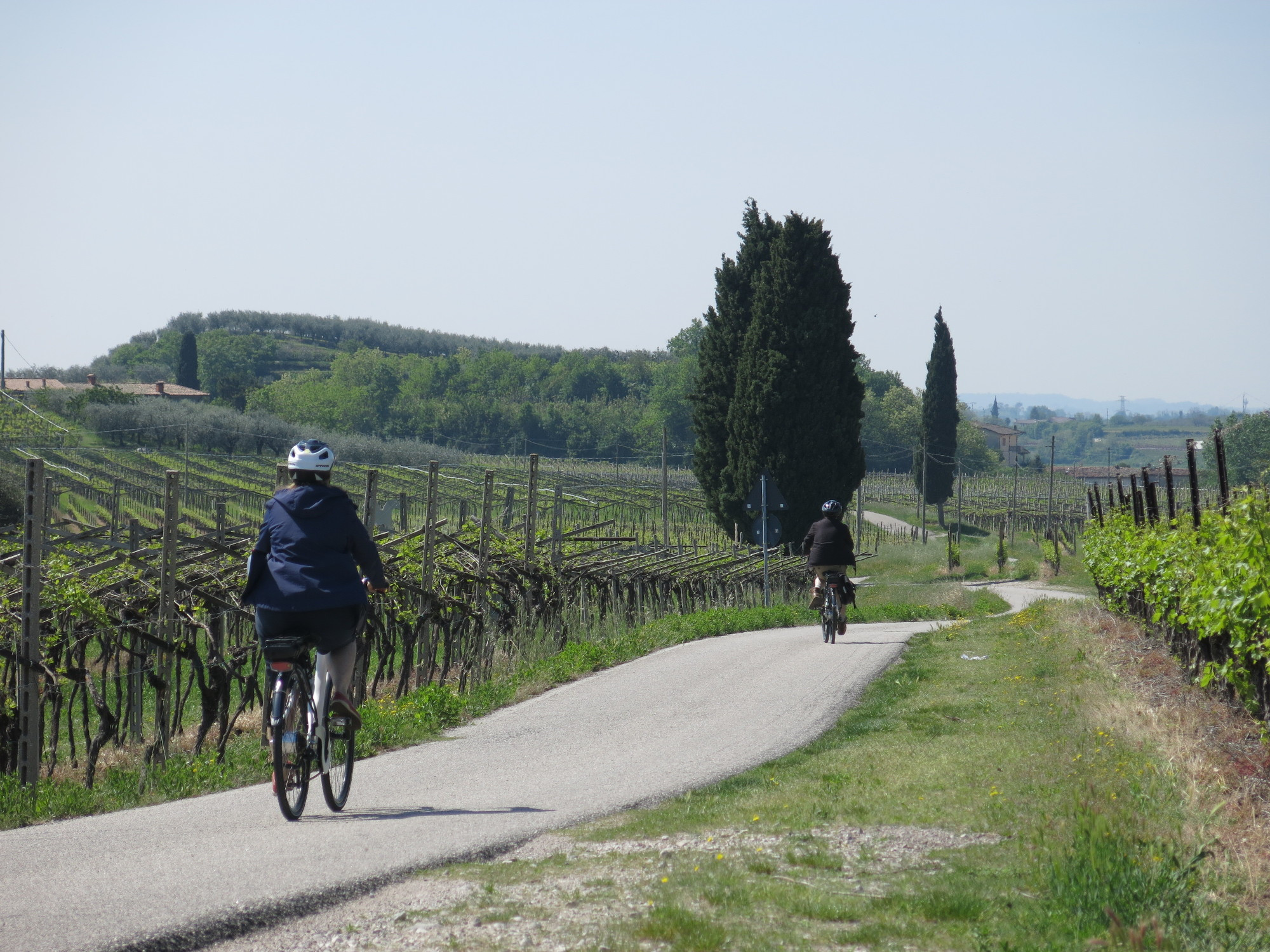Usciamo dal centro di Verona e seguiamo una pista ciclabile che ci avvicina alle colline moreniche che circondano il lago, con bei panorami sulla Valpolicella. Pedaliamo su strade di campagna, tra uliveti e vigneti su strade leggermente ondulate, fino ad arrivare finalmente a Bardolino: non c’è posto migliore per una pausa gelato!