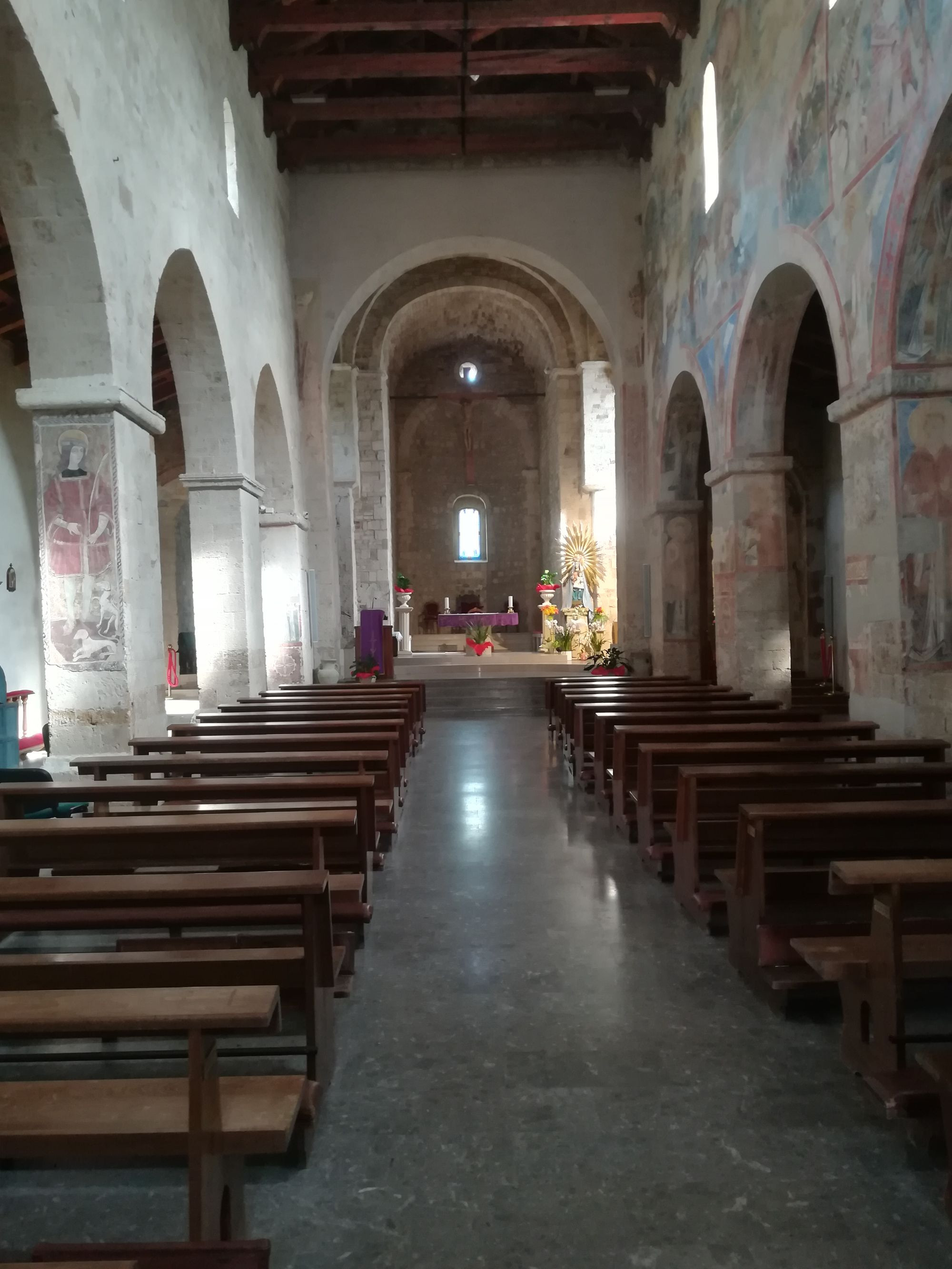 La struttura attuale del santuario, datata tra l'XI secolo ed il XII secolo costruita in tufo e travertino, presenta elementi architettonici di notevole importanza quali, l'abside, il campanile e il portale in stile. L'esterno absidale è sicuramente la parte più cromatica e più raffinata dell'intero edificio, si ammirano ornamenti ad intagli, archetti pensili, lesene e un finestrone centrale adornato. Sulle pareti esterne numerose formelle con figure di animali a rilievo, di provenienza ignota, creano un effetto davvero suggestivo. Il tetto a più falde e l'armonia dei volumi, conferiscono al santuario un aspetto piacevole ed imponente. Splendidi e suggestivi affreschi sulle pareti della navata centrale.