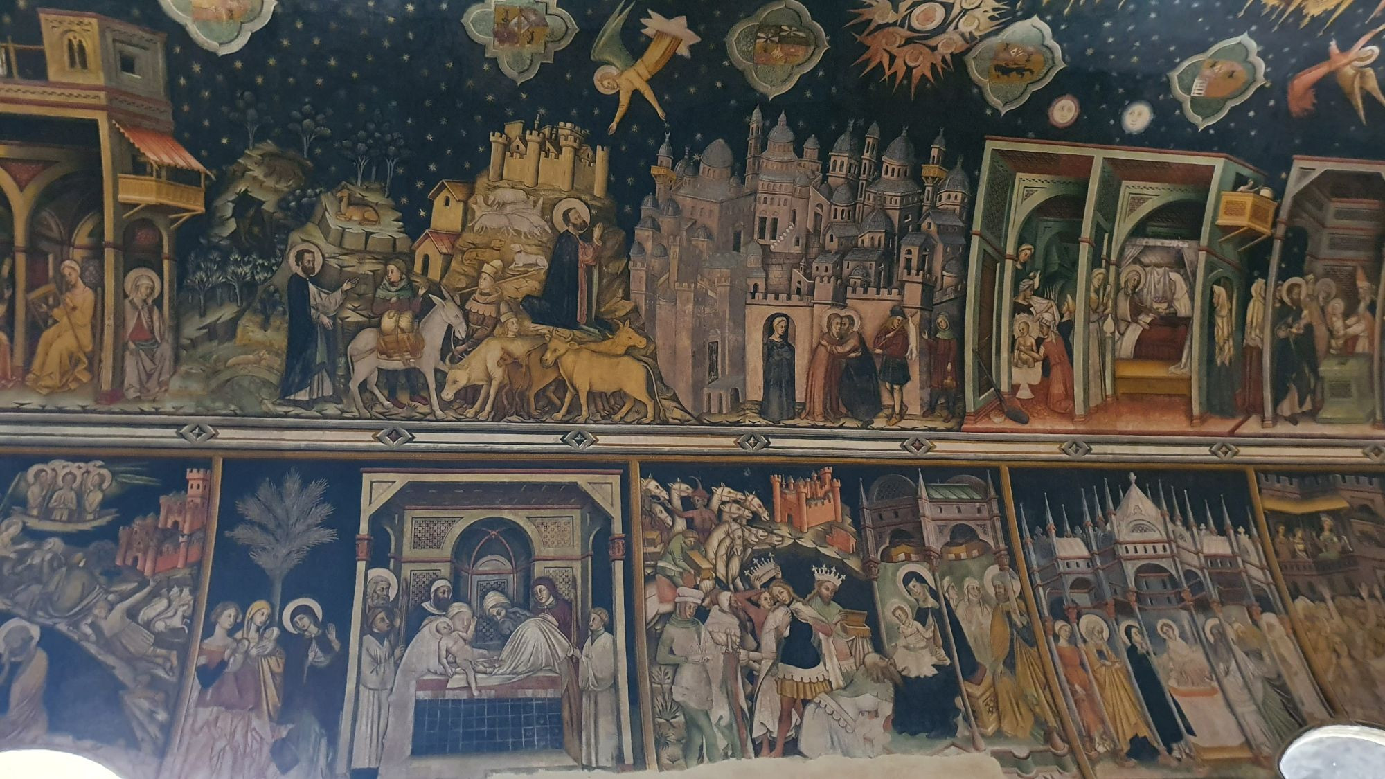 Quello che colpisce il visitatore ignaro che entra nella Basilica di Santa Caterina d’Alessandria è il ricco palinsesto pittorico che impreziosisce l’interno della chiesa. Le pareti, i pilastri e le volte della navata centrale sono completamente ricoperti di affreschi realizzati tra fine Trecento e i primi decenni del Quattrocento. I cicli del Giudizio Universale, della Genesi, della vita di Gesù e della vita di Santa Caterina d’Alessandria scandiscono le campate della navata centrale e lasciano i fedeli e i viaggiatori a bocca aperta per la quantità e qualità delle pitture.