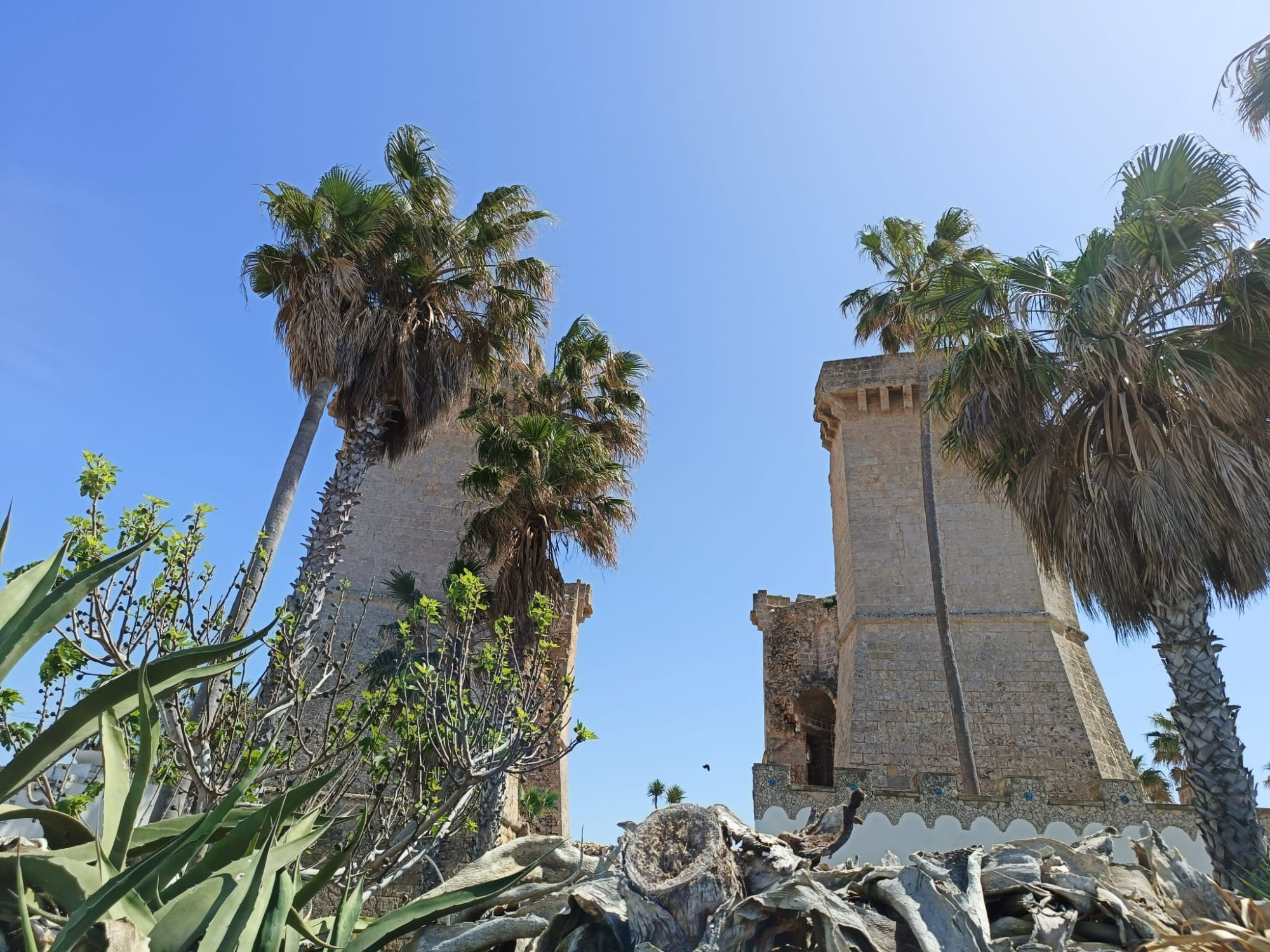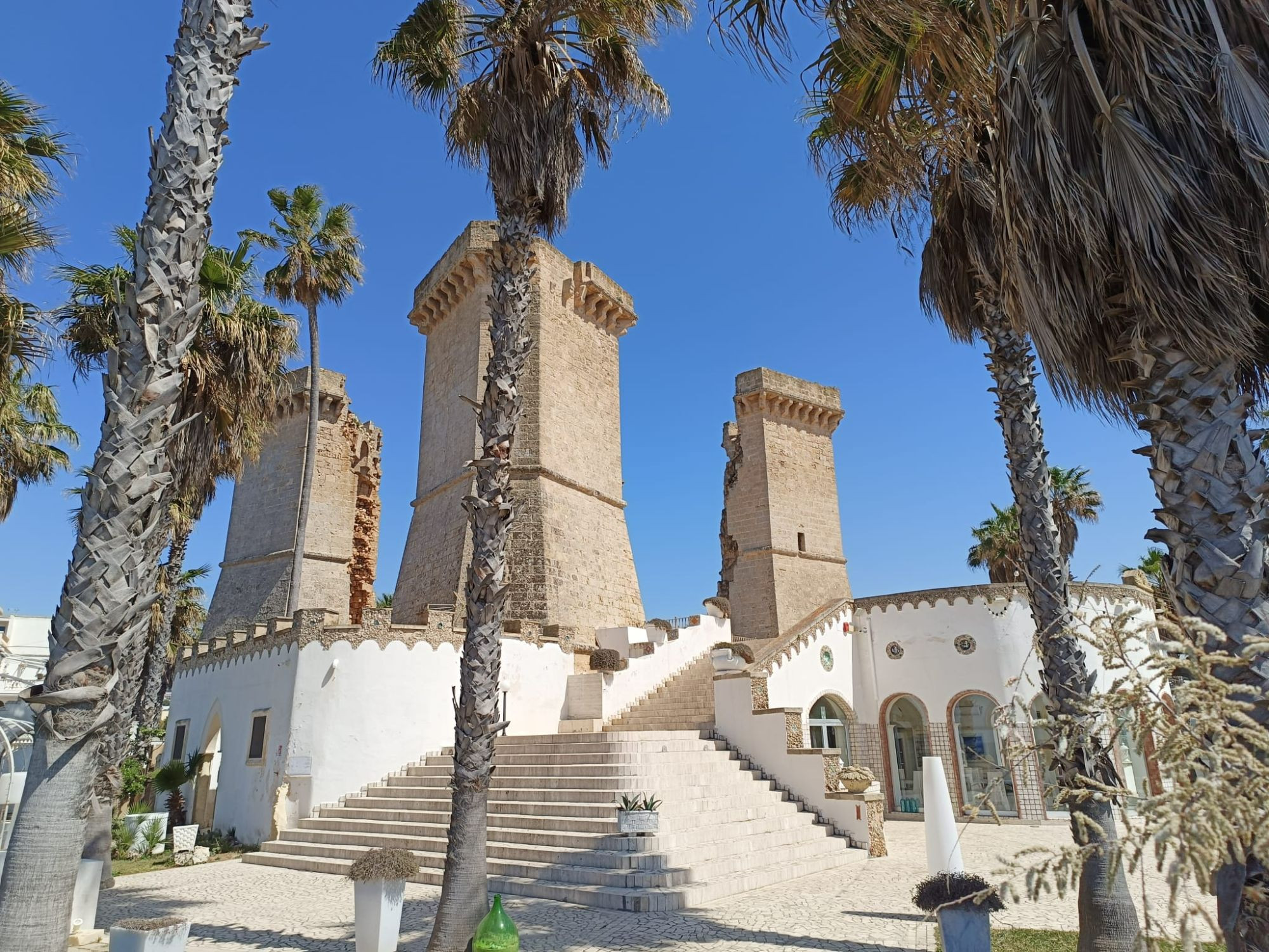Torre del Fiume è conosciuta come “le Quattro Colonne”, per via della sua struttura attuale. Le quattro torrette angolari sono ciò che rimane di una grande torre di avvistamento risalente al XVI secolo, parte del sistema di difesa costiero realizzato e perfezionato tra fine Quattrocento e Cinquecento per proteggere le coste meridionali dagli attacchi dei pirati turchi. Siamo a Santa Maria al Bagno, piccolo borgo marinaro di Nardò dalle antiche origini romane, oggi diventato popolare meta di villeggiatura.